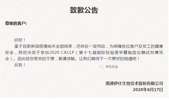 由衷致歉:受疫情影響,我公司不參加2020 CACLP